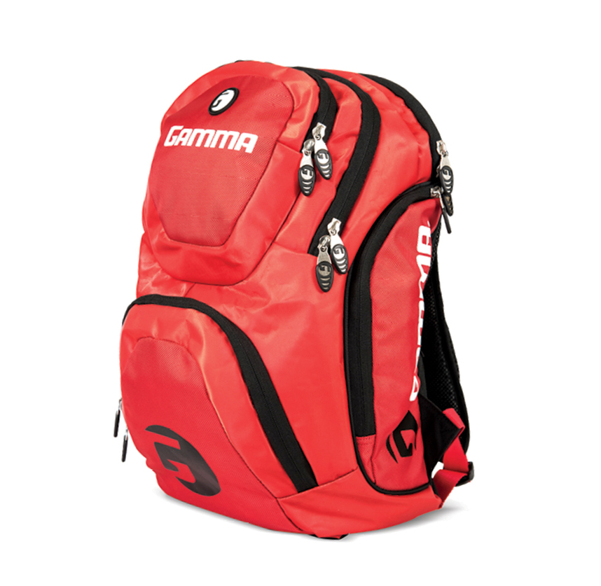 The whole pickleball kit—paddle, shoes, balls, snacks—fits in the larger inner and medium outer pockets; padded shoulder and back pads are body-kind. Gamma Sports Red and White Backpack, $80; gammasports.com