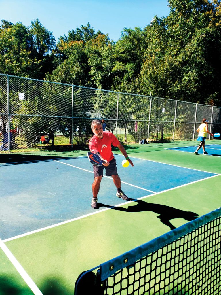 “I was mostly playing tennis until 2017, when I had major back surgery that limited my tennis abilities, so I switched to pickleball. It was a natural transition, but then I got serious about it. We didn’t have it up at my home in the mountains, just tennis courts, so I started teaching a few of the ladies and gentlemen up here how to play on those. Most of the people here are younger than I am 50s, 60s, 70s—but that didn’t matter. I set up games, and people just dropped in. It’s a great way to make new friends. Now we have four pickleball courts painted on the tennis courts and a growing group of enthusiasts—there’s about 60 on our email list—and we’re looking to get some permanent pickleball courts put in. I’m the pickleball ambassador up here.”