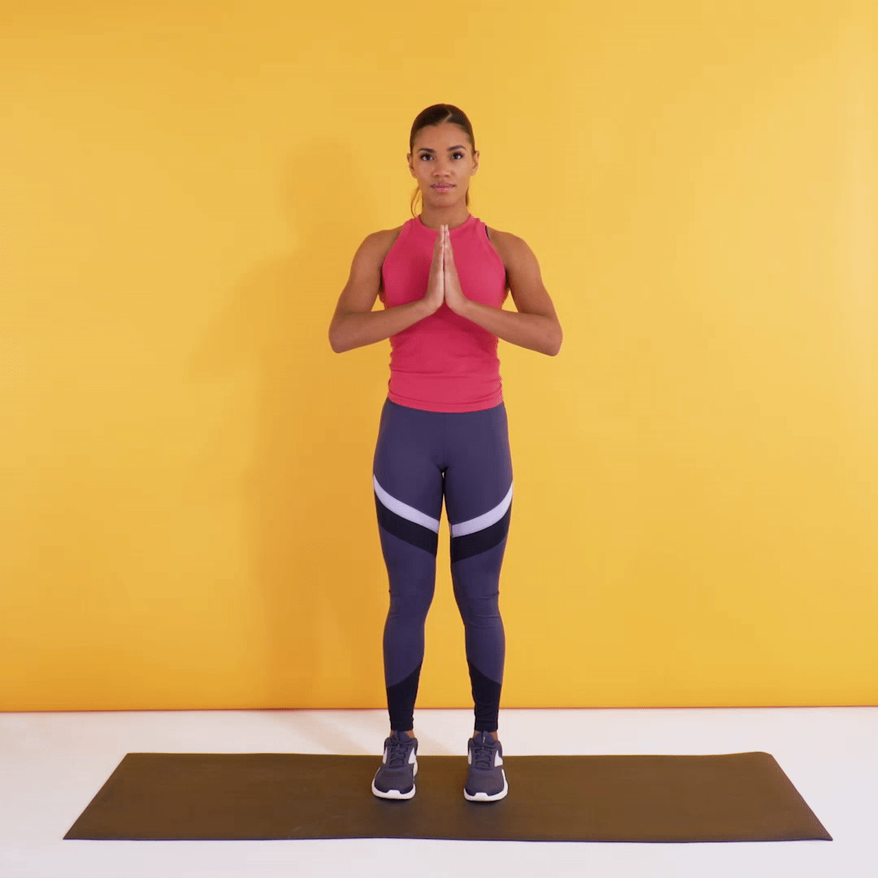 B. Step your right foot out to the right. Keep your left leg straight as your right knee bends over your right ankle. Reach your right glute back as if you’re trying to sit in a chair. Pull your navel in, then press down through your right heel to return to starting position. Do 10 times, then switch sides and repeat 10 times.