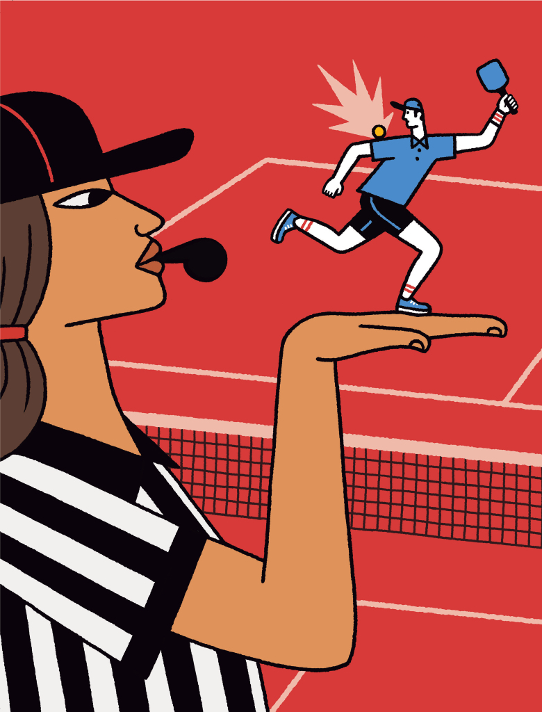 Tagging an opponent is, for Dan Ewing, 47, “one of the better aspects of the sport,” though he also disagrees with taking aim at the head. For Thunder Dan, as he’s known in certain Lexington, Kentucky, pickleball sets, there’s no benefit to aiming that high, not to mention there’s a greater risk of injury. Otherwise, tagging is all right by him: “You can drill an opponent with a good shot, score a point or win a rally with it, and not feel guilty about it.”