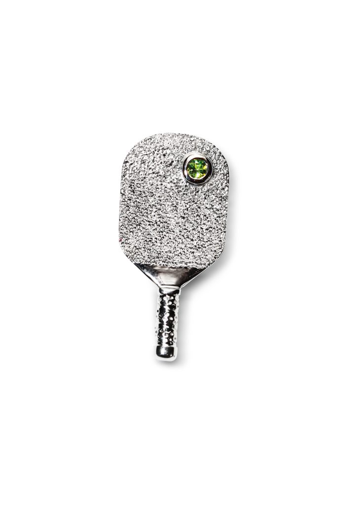 Master jeweler Bruce Workman—who has been designing jewelry for 35 years—created this pendant after he began playing pickleball last year. It’s set with a peridot “pickleball,” and Workman can customize the back with initials or dates. Paddle with Bezel Set Peridot, $149 for sterling silver, $500 for 10K gold; pickleball-bling.com
