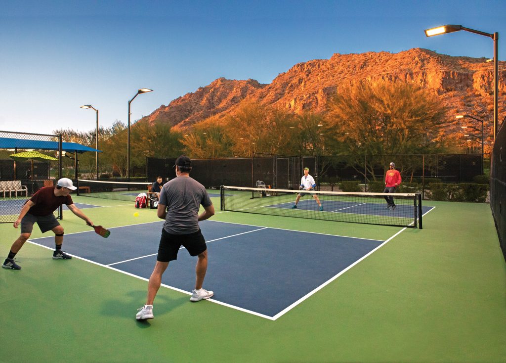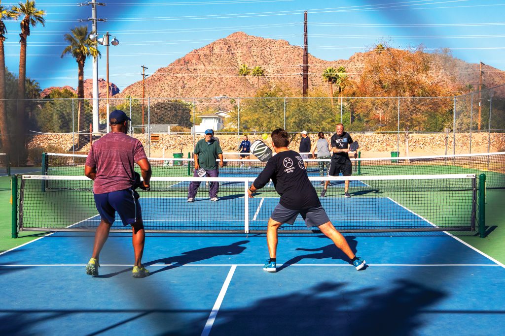 The sun has just kissed the top of Camelback Mountain at 6:45 a.m. Three of four pickleball courts at G.R. Herberger Park near the Phoenix/Scottsdale border are filled with doubles matches. By 7 a.m., players are racking up to take on the winners in an informal round-robin that packs these courts, backdropped by the iconic mountain, each morning in the coolish November-to-May time frame.